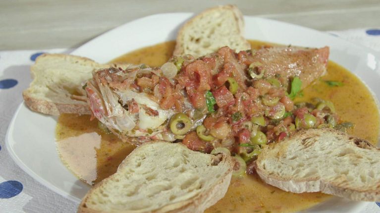 Una zuppa di pesce con fette di pane tostate, da abbinare con un ottimo vino bianco fruttato.