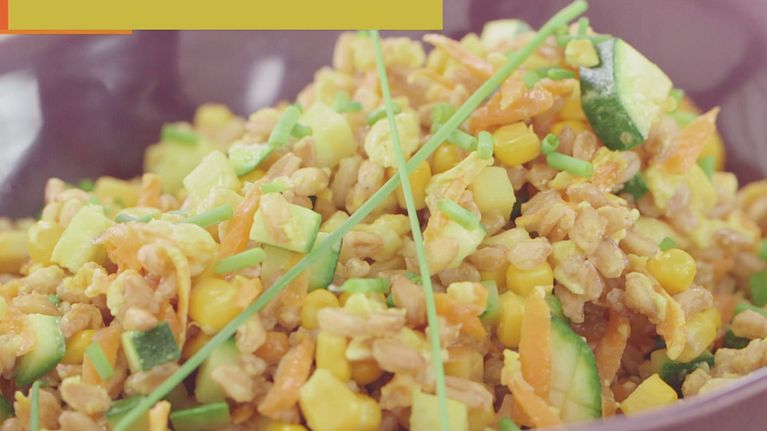 Il farro è ricco di proteine e di fibre, amico inoltre delle ossa, poiché contiene calcio e selenio. Gianluca Mech ne sfrutta oggi le proprietà, creando una bella e gustosa insalata con varie verdure