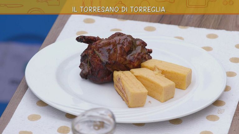 Piccione arrosto ripieno di aromi e frattaglie tritate, servito con deliziosa polenta.