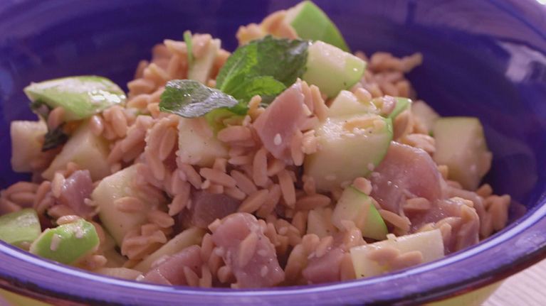 La mela contiene poche calorie e molte fibre ed è diuretica. Gianluca Mech ci propone una ricetta originale: "Risino freddo con tartare di tonno e mela"