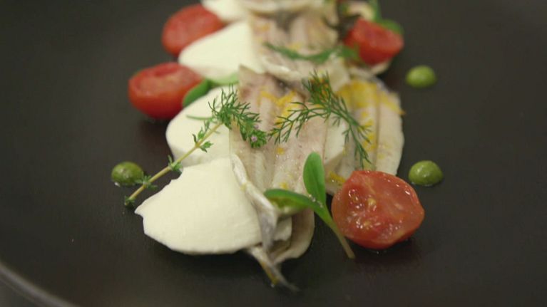 Un gustoso piatto a base di alici marinate, con mozzarella e pomodoro.