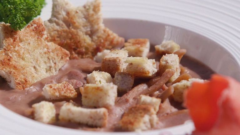 Una zuppa di pasta di grano antico con fagioli verdon e crostini di pane.