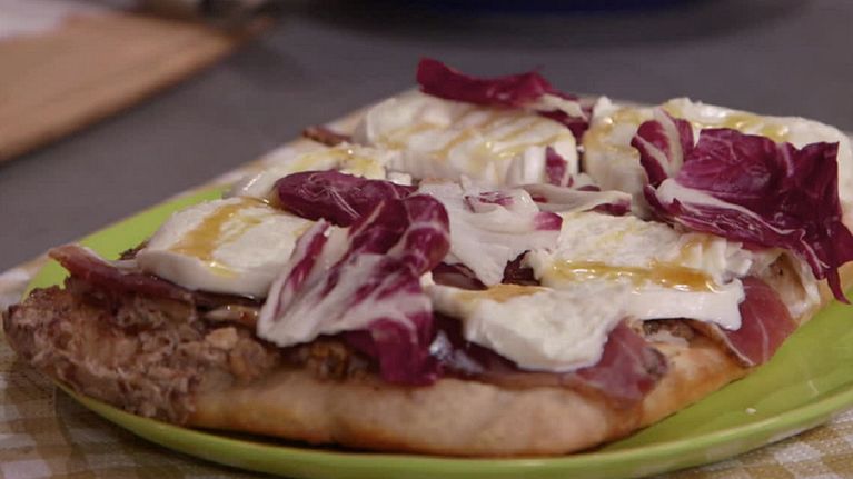 Un trionfo di sapori dato da ingredienti che si sposano alla perfezione: radicchio, noci, mozzarella di bufala, parmigiano, pecorino, speck e miele di castagno.