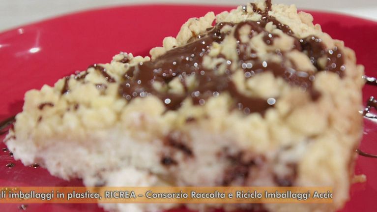 Un'invitante torta a briciole con crema di ricotta dolce e gocce di cioccolato.