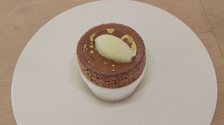 Soufflè al cioccolato e panpepato con sorbetto alla pera