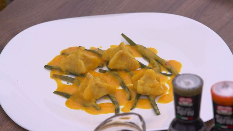 Ravioli di patate ripieni di scampi, con zafferano di Navelli
