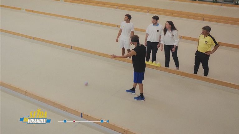 Stefano Corti e Kristian Ghedina si affrontano nella seconda sfida: bocce alla cieca.