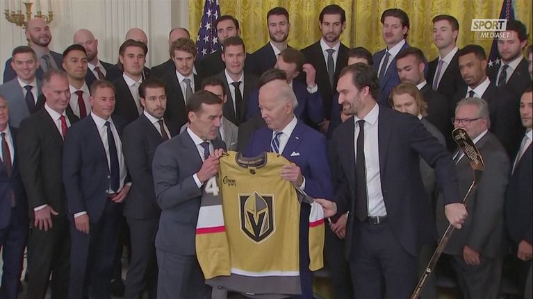 I"Las Vegas Knights, campioni di hockey sul ghiaccio, hanno omaggiato Joe Biden, presidente degli Usa."