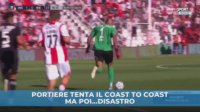 Il portiere del Deportivo Riestra esce dall'area di rigore e si spinge fino a centrocampo palla al piede, ma poi la perde malamente e il centrocampista avversario ne approfitta segnando il gol del 2-0