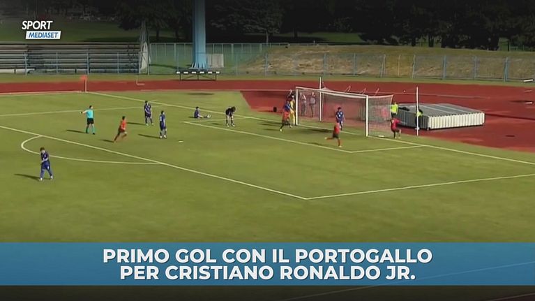 Cristiano Junior, figlio di Cristiano Ronaldo, ha segnato il suo primo gol con il Portogallo under 15 e ha esultato proprio come il padre. Video: Twitter.