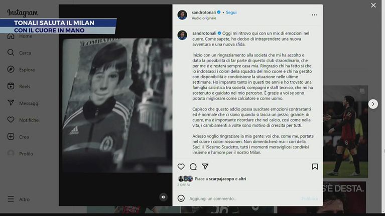 Tonali saluta il Milan