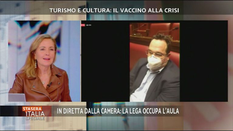 L'aula della Camera occupata dalla Lega che protestano a favore della riapertura delle attività