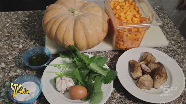 Luca Galtieri si trova al Centro metropolitano di formazione professionale di Marino, vicino Roma, dove il piatto anti-spreco del giorno è lo scartato di zucca. Ecco gli ingredienti: buccia di zucca, buccia di formaggio, semi di zucca, gambi di prezzemolo, buccia di patate e pianta di ortica. Scarto che diventa arte per non sprecare più.