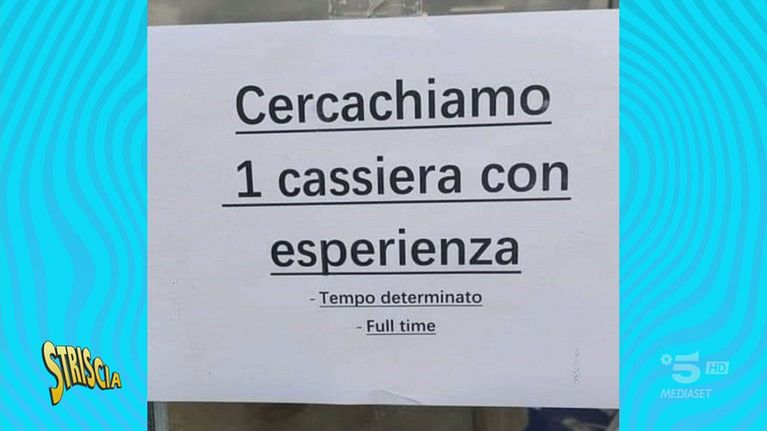 A Striscia il cartellone "cercachiamo 1 cassiera con esperienza"