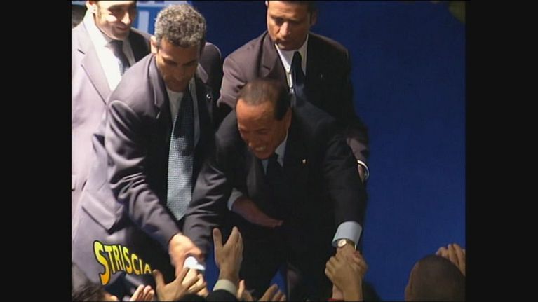 Il Cavaliere si sporge per salutare i suoi sostenitori e...