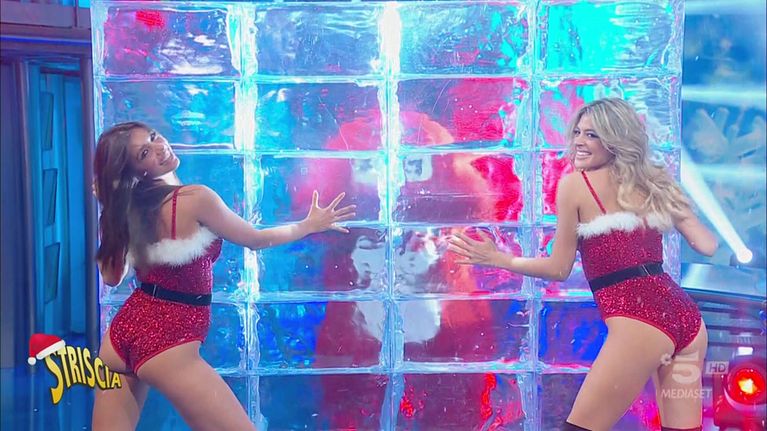 Sulle note di "Count on Christmas" di Bebe Rexha, Anastasia e Cosmary (con il Gabibbo) ballano sotto la neve sul bancone"di"Striscia