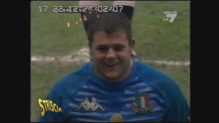 Durante la partita di rugby Italia-Scozia il pallone finisce in testa a un giocatore.