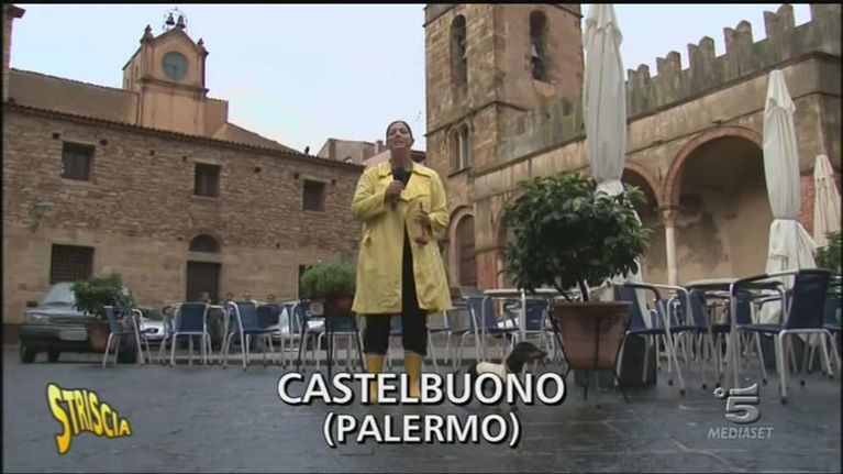 Stefania Petyx e il bassotto sono a Castelbuono (PA) per parlarci di lavori stradali.