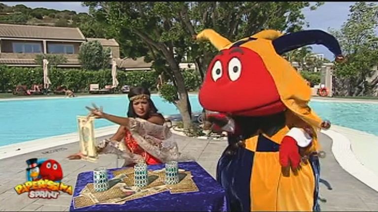 Vediamo Giorgia Palmas impegnata in uno sketch con il Gabibbo, durante la sua conduzione di Paperissima Sprint