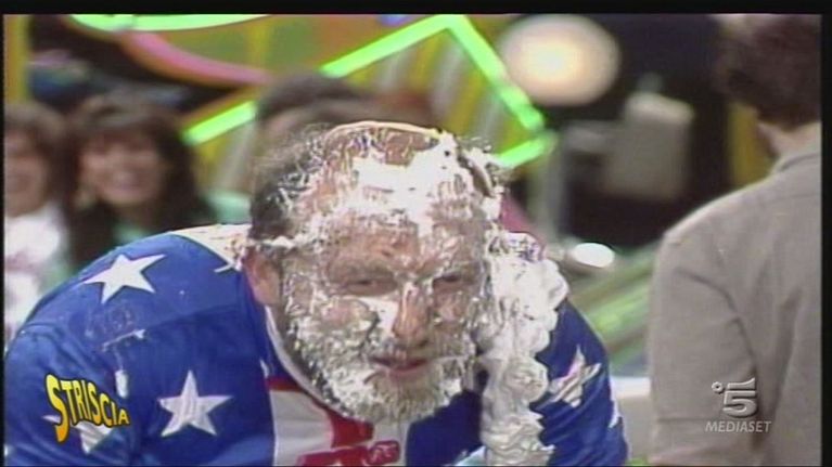 Gerry Scotti sfonda il bancone di Striscia