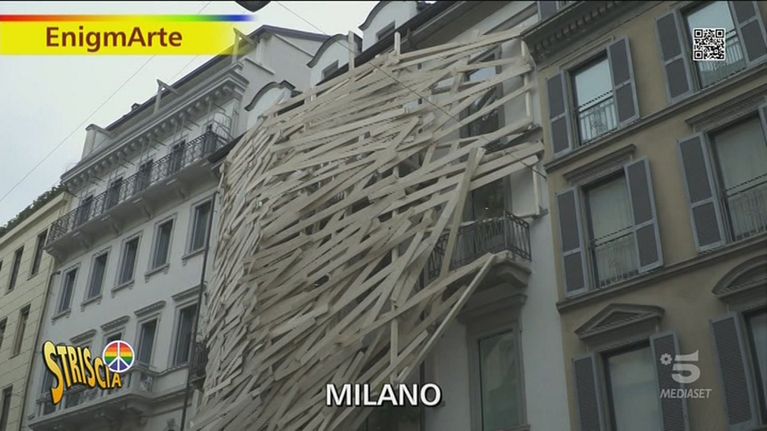 Squaglia si trova a Milano per un altro caso di Enigmarte: si tratta di una facciata di un palazzo totalmente ricoperto di travi di legno, quasi come se fosse un nido