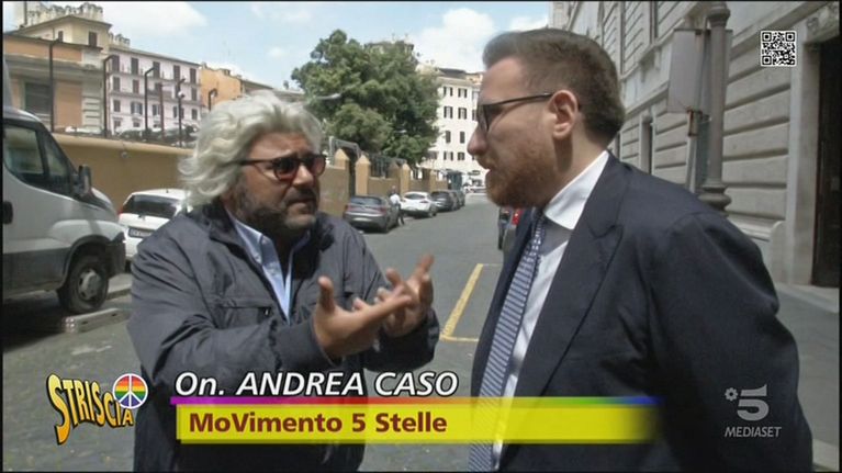 Beppe Grillo cerca di abituarsi alla sua nuova veste di guru del Movimento 5 Stelle e dà qualche suggerimento a Alessandro Cattaneo (Forza Italia), Luca Carabetta e Andrea Caso (Movimento 5 Stelle)