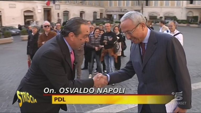 Giampaolo Fabrizio, nei panni di Bruno Vespa, raccoglie dichiarazioni sulla Tremonteide e le lotte interne al PD