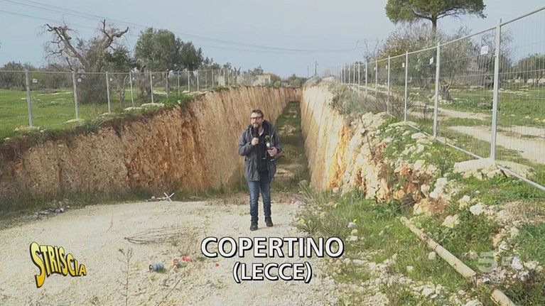 Pinuccio è a Copertino (Lecce) per mostrarci un lungo e profondo canale di raccolta delle acque che sarebbe dovuto arrivare a una vasca. I lavori sono cominciati anni fa e sono costati molto ma l'opera non è ancora conclusa e ora impedisce agli agricoltori di raggiungere i loro campi. E quando piove la situazione peggiora