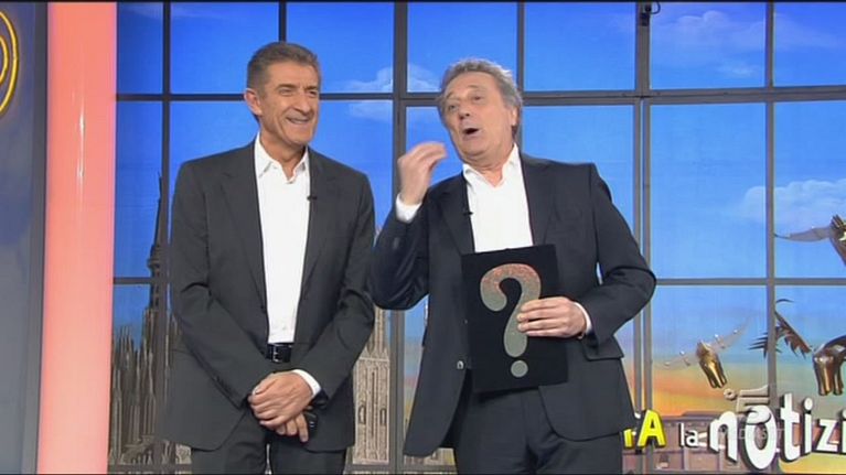 Gerry Scotti sfonda il bancone di Striscia
