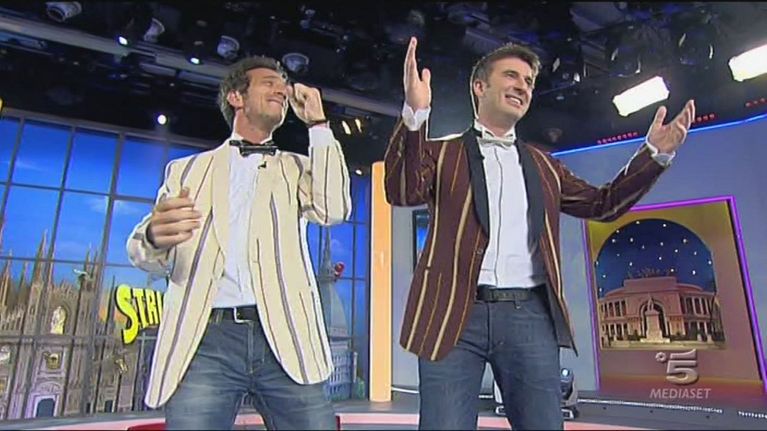 Greggio e Iacchetti fanno il loro ingresso alla conferenza della 38esima edizione di Striscia la notizia