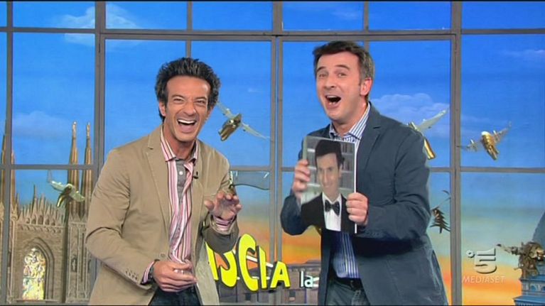 Esilarante scambio tra Lorella Cuccarini, Greggio e Iacchetti a Striscia. I due conduttori hanno entrambi una freccia ad altezza deretano ma Enzino si lamenta del fatto che quella di Ezio sia posizionata più in alto...