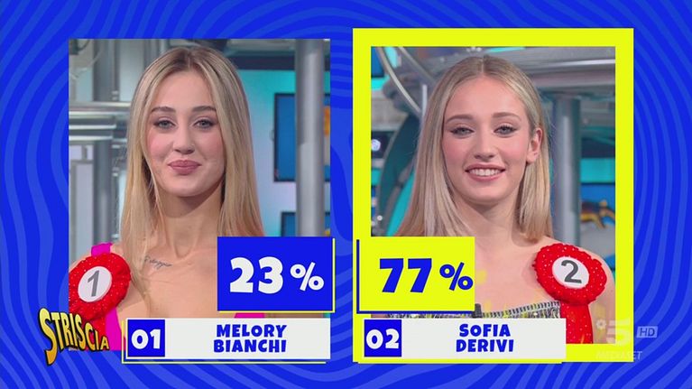 Si sono aperte stasera le selezioni per la scelta della nuova Velina bionda del tg satirico: il pubblico ha scelto Sofia Derivi di Desio, 20 anni, che ha ottenuto il 77% delle preferenze. L'altra aspirante Velina della prima serata, Melory Bianchi di Cesena, 23 anni, ha ottenuto il 23% e potrà essere ripescata. Per votare ogni sera, durante la diretta, anche nei prossimi giorni sarà possibile farlo tramite smart tv abilitate, app Mediaset Infinity e su www.mediasetinfinity.it (max 1 voto ...