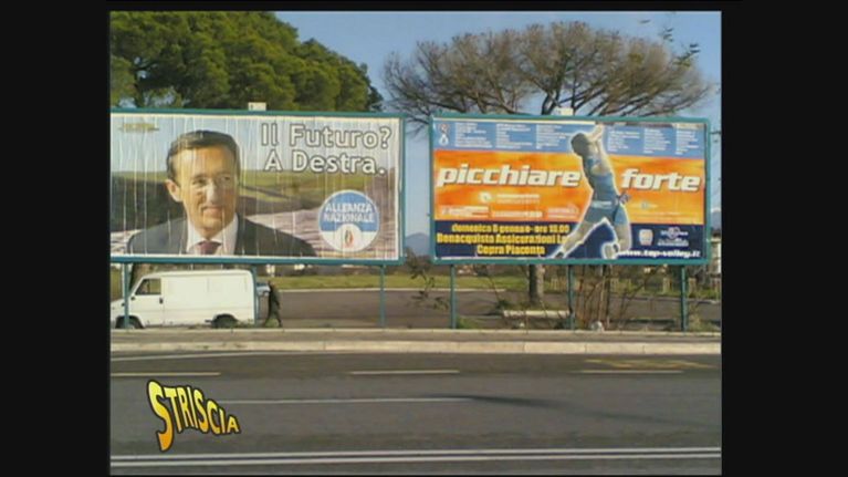 Il manifesto di Alleanza nazionale accostato ad un manifesto pubblicitario crea un effetto surreale.