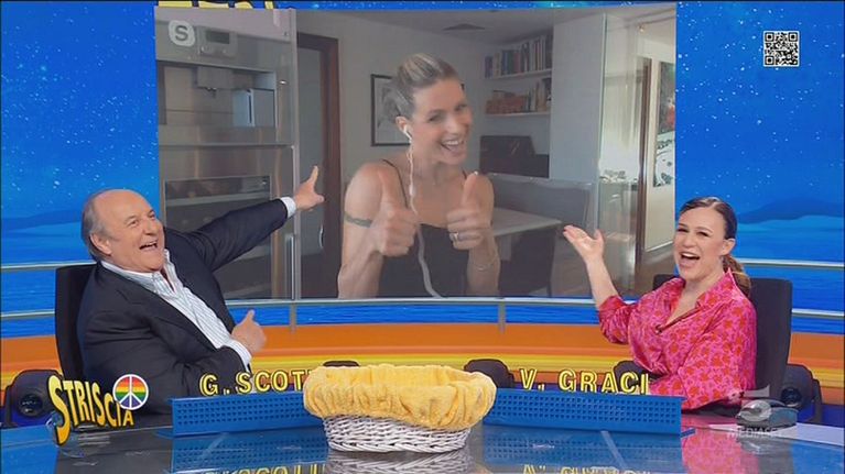 Michelle Hunziker è in isolamento perché risultata positiva al Covid e non può condurre Striscia la notizia, ma Gerry Scotti e Valeria Graci si collegano con lei per sapere come si sente e come sta affrontando questi giorni a casa