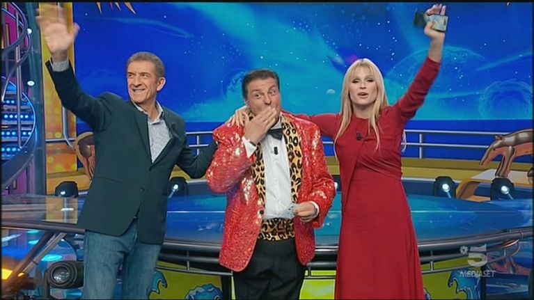 Ezio Greggio e Michelle Hunziker scherzano con Claudio Lauretta che ha fatto le voci di tutti i personaggi che hanno chiamato la conduttrice questa settimana