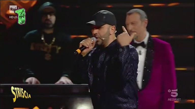Dalla gag nella quale ha indossato i panni di un rapper e ha cantato sul palco dell'Ariston la canzone "Poco ricco" fino al suo videomessaggio di "stima" ad Al Bano. Le volte in cui l'attore è finito nella rubrica di Striscia la notizia.