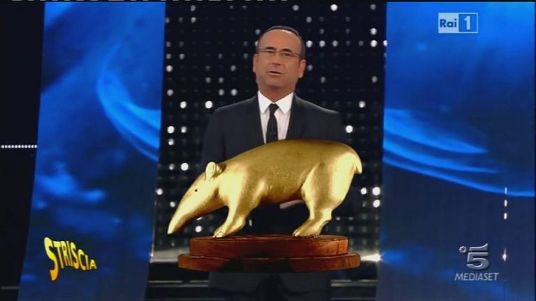 Valerio Staffelli ha consegnato un Tapiro d'oro a Carlo Conti.