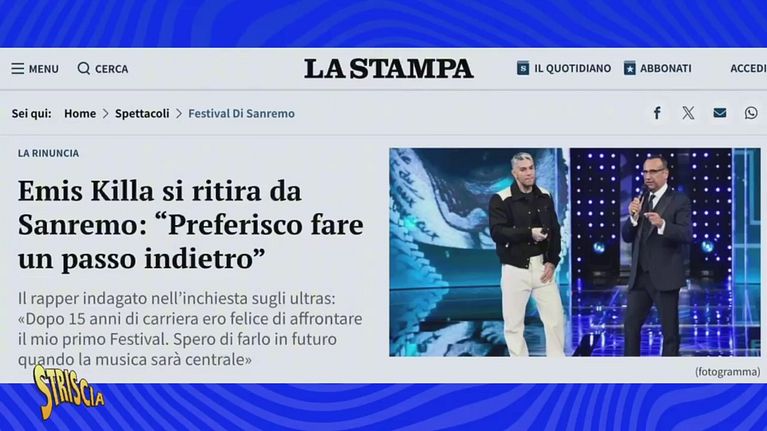 Questa sera a Striscia la notizia (Canale 5, ore 20:35) Pinuccio torna a parlare del Festival di Sanremo con una notizia: Emis Killa ha deciso di ritirarsi dal cast dei Big in gara, dopo essere stato indagato per associazione a delinquere nell'ambito dell'inchiesta sulla "Doppia Curva" a Milano, che ha portato all'emissione di un Daspo che gli vieta di accedere agli stadi per tre anni.