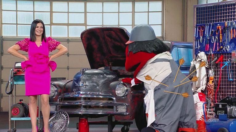 Vediamo Roberta Lanfranchi impegnata in uno sketch in officina insieme al Gabibbo durante la conduzione di Paperissima Sprint, tra gag e risate