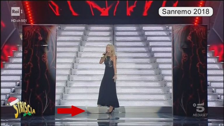 Nell'edizione 2018 del Festival Michelle Hunziker, scendendo dalla scalinata del palcodel teatro Ariston di Sanremo è costretta ad affrontare una serie di imprevisti. Tra cui larottura di un gradino e la perdita di una scarpa, cui cercano di ovviare, posizionaticarponi alle sue spalle, Pierfrancesco Favino e Claudio Baglioni. Una gag in realtàrisalente al 1971 e andata in onda sulla BBC