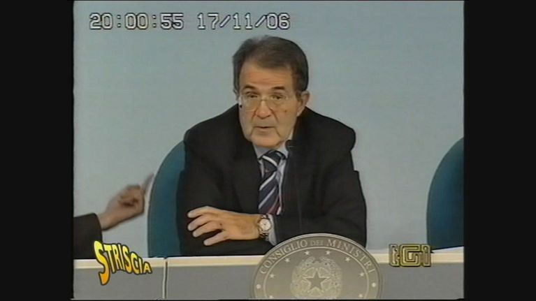 Durante una conferenza con Romano Prodi il portavoce Silvio Sircana fa uno strano gesto con la mano.