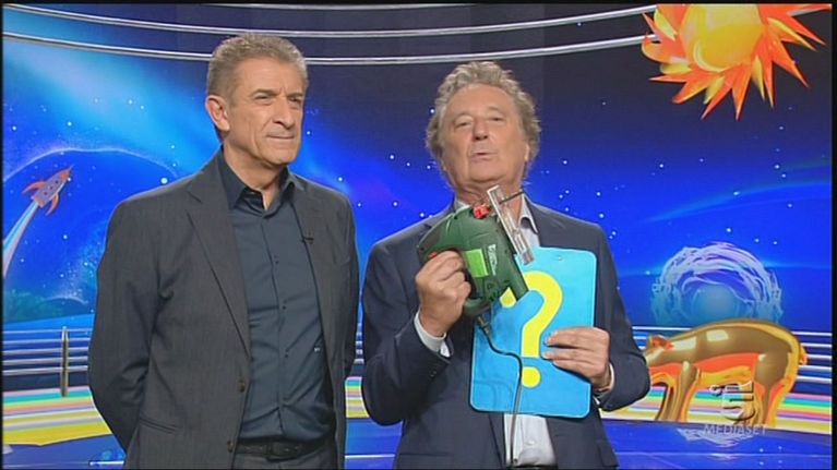 Gerry Scotti sfonda il bancone di Striscia