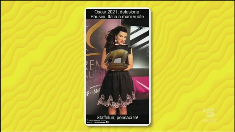 Gerry Scotti nel pre puntata di lunedì 26 aprile 2021 premia Michelle Hunziker con l'Oscar per la migliore conduzione femminile del tg satirico di Antonio Ricci
