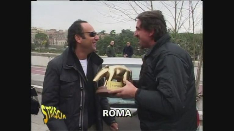 L'ultima volta (ad oggi) che il conduttore di RaiUno ha ricevuto il trofeo di Striscia la notizia è stato nel 2015. Ma con Staffelli gli incontri negli anni sono stati diversi. E in un'occasione la statuetta si è rotta.
