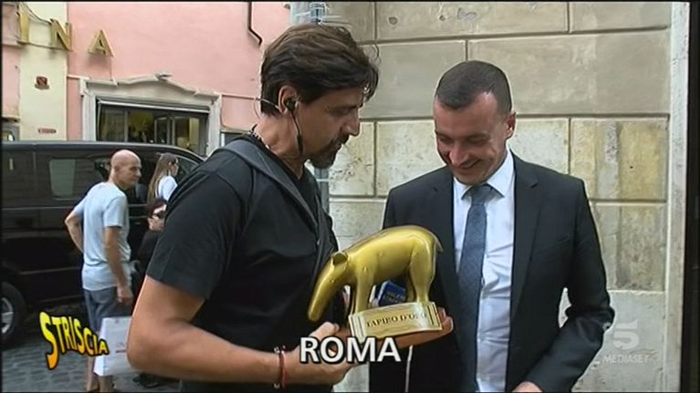 Valerio Staffelli consegna il tapiro d'oro a Casalino, portavoce del premier Conte, per la polemica scatenata dalla diffusione della sua intercettazione dai toni forti con il Ministero dell'Economia e delle Finanze.