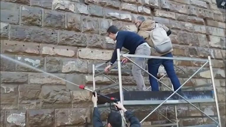 A Firenze il sindaco ferma il blitz degli attivisti e poi ripulisce la facciata di Palazzo Vecchio