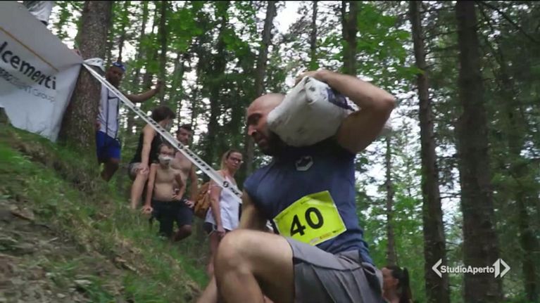 170 metri in salita con un sacco di cemento da 25 chilogrammi in spalla: anche quest'anno in Val Seriana è andata in scena la corsa dei muratori bergamaschi.