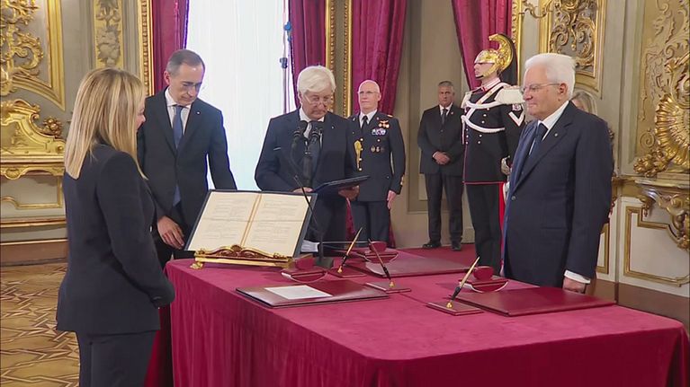 Giorgia Meloni pronuncia la formula di rito davanti al Presidente Sergio Mattarella. La prima donna a Palazzo Chigi nella storia del nostro paese.