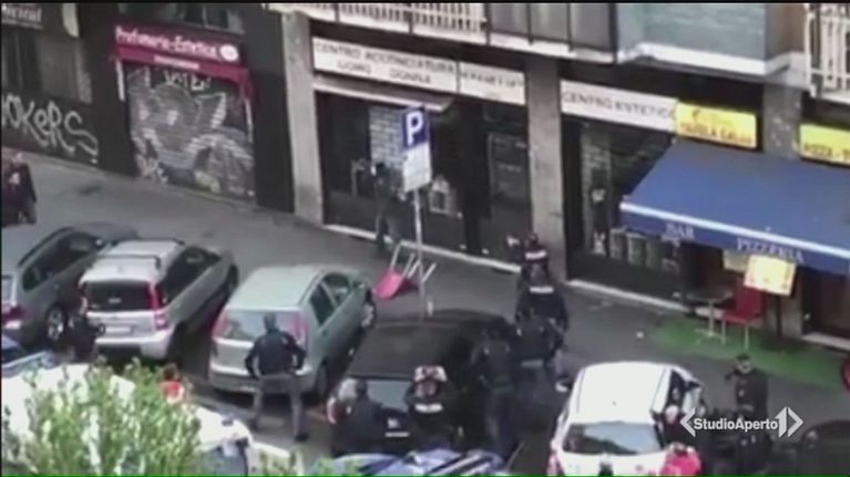 Armato di due coltelli, un africano si è scagliato contro un poliziotto che gli ha sparato ferendolo a una gamba.
