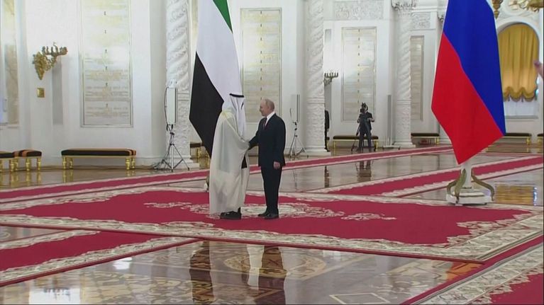 Putin accoglie a Mosca il presidente degli Emirati Arabi Mohamed bin Zayed Al Nahyan.